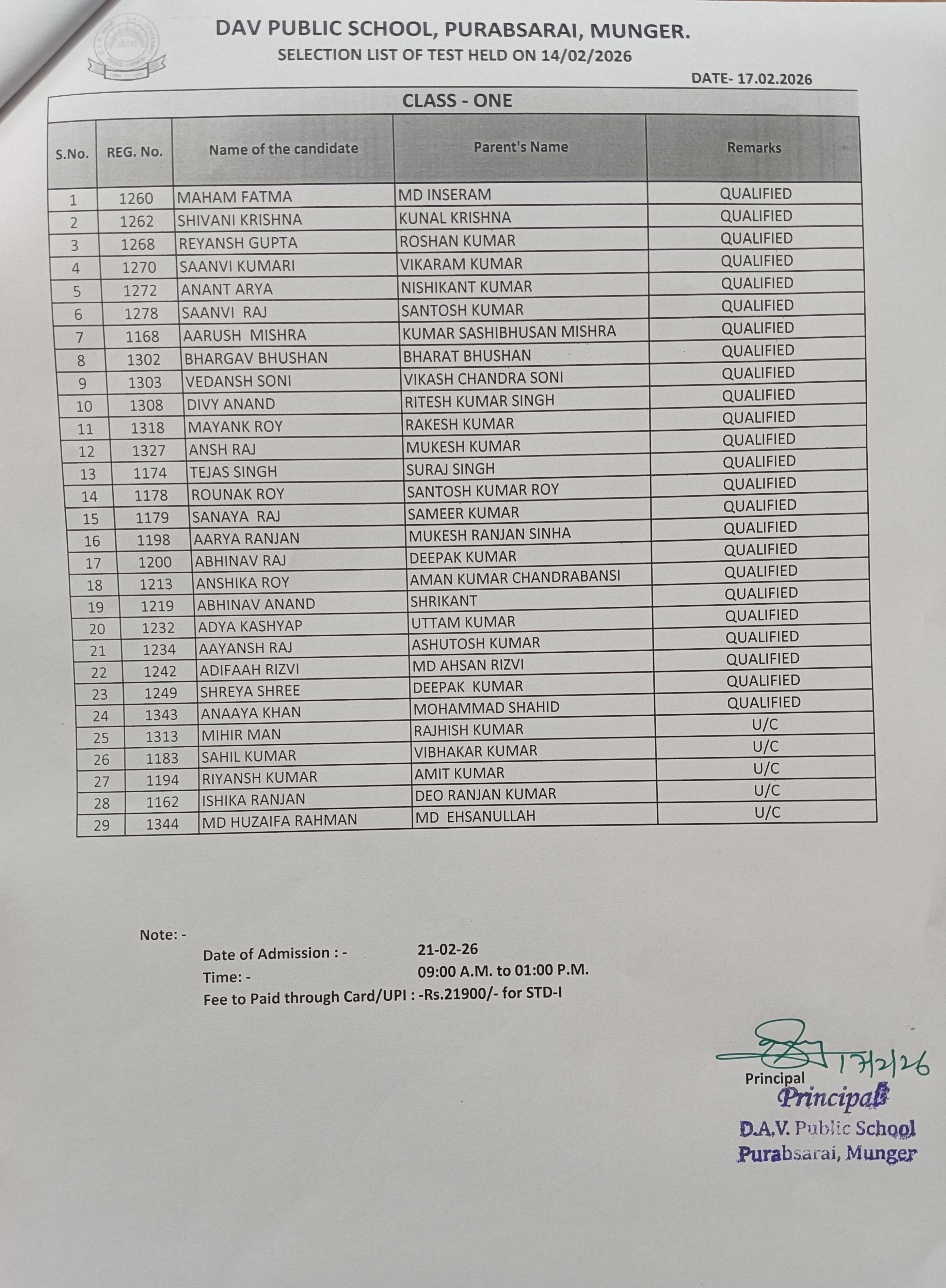 ENTRANCE TEST RESULT FOR STD. - 1 HELD ON 14/02/2026. DOWNLOAD RESULT FROM HERE..........